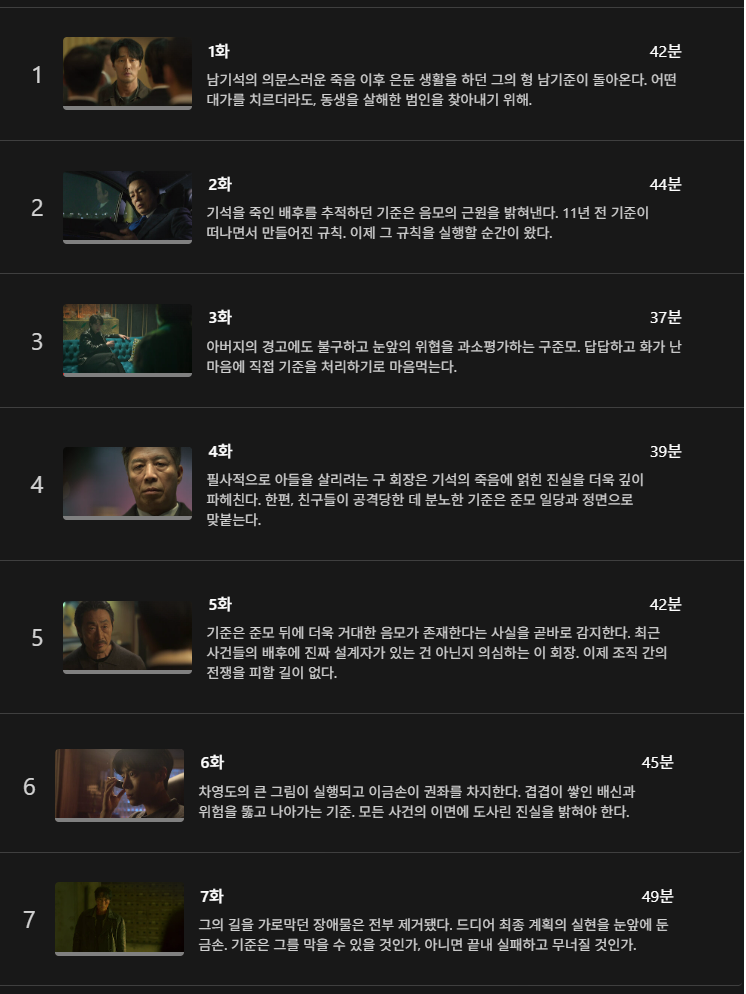 동생의 죽음을 파적하기 위해 다시 조직의 세계로 뛰어든 기준은 냉혹하고 강렬한 복수의 여정을 펼치며, 그 과정에서 얽히고설킨 인물들의 욕망과 배신이 드러납니다. 원작 웹툰의 서늘한 분위기를 유지하면서도, 드라마만의 오리지널 스토리가 추가되어 세계관을 확장했습니다.